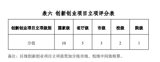 学生参加学校、二级学院组织的创业创新活动,并经二级学院认定,一学年总共不少于3次。若满足以上条件,学生获创新创业能力模块基本分12分。如果没有满足,按4分/次扣分。创新创业项目立项加分见表六,项目负责人按相应项计满分,项目参与人按相应项减半加分;创新创业活动比赛获奖参照表二《文化艺术体育活动获奖评分表》加分。