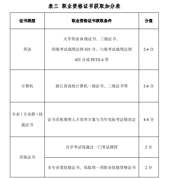 学生每学年在基本技能、专业(专业群)技能、自学考试、其他职业资格等方面证书获取的能力。学生当学年计算机、英语课程成绩达到合格,经二级学院认定,获专业技术能力模块基本分15分。若没有达到,按7.5分/门扣分。其他加分标准见表三。