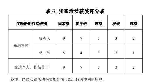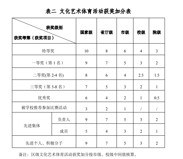 学生在各级各类文化艺术体育活动中(包括五四评先评优、学年评先评优)获奖加分。团体活动获奖,参与者若没有分主次,加分减半;若分主次,排名第一者按相应项计满分,其他参与者按相应项减半计分。