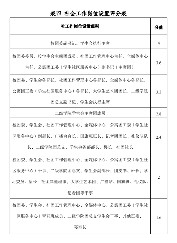 担任学生干部等社会工作职务满一年并经任用部门考核合格的,兼任多项职务的,按最高职务计分,不累加计分;对于任职不满一年的,加分减半;学期成绩中出现不及格课程者,不加分。加分标准见表四。