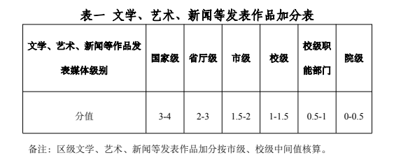 学校会根据作品的质量、媒体级别和权威性,依据表一的评分标准确定具体媒体发表作品的分值。所有作品加分应有证明(广播、电视发表作品要有播出单位的播出证明或影音复制件),不同作品可累计加分,同一作品被不同媒体发表或转载的,只计最高分,不累计加分;集体合作作品的第一作者按相应项计满分,其他作者按相应项减半计分;集体合作作品如第一作者为教师则相应第一个学生作者认定为第一作者。学生记者、编辑等从事宣传工作的学生在校级以上发表的新闻作品方可纳入加分范畴。